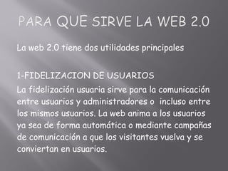 Este documento describe las características y utilidades de la Web 2.0, incluyendo la fidelización de usuarios a través de la comunicación entre ellos, y la promoción social a través de redes sociales donde los usuarios comparten contenido. También enumera varias herramientas web 2.0 como Wikispaces, Slideshare, Youtube, Scrapblog y Google Docs que permiten la colaboración y el intercambio de contenido entre usuarios.