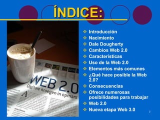 La Web 2.0 representa la evolución de las aplicaciones tradicionales a aplicaciones enfocadas en el usuario final, introduciendo colaboración y servicios en línea. Se caracteriza por software basado en la web sin necesidad de instalar, compartir contenido entre usuarios, y convertir a los usuarios en creadores de contenido a través de blogs y redes sociales. La Web 3.0 se asocia con darle significado semántico a la web para mejorar la experiencia del usuario.
