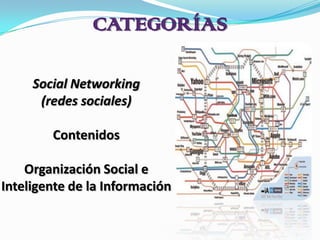 El documento habla sobre las redes sociales y las herramientas digitales para la creación y distribución de contenidos en línea. Define las redes sociales como estructuras sociales compuestas por grupos conectados por relaciones e identifica algunas de las redes sociales más populares como Facebook, Twitter y YouTube. También describe herramientas para blogs, wikis, hojas de cálculo y almacenamiento de fotos y videos en línea.