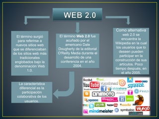 El término web 2.0, acuñado en 2004, se refiere a la evolución de los sitios web hacia plataformas que permiten la participación colaborativa de los usuarios. Ejemplos de web 2.0 incluyen Wikipedia, donde los usuarios pueden crear contenido, y Slideshare, que permite subir y compartir presentaciones. Estos servicios facilitan la enseñanza y el aprendizaje en línea sin requerir conocimientos técnicos adicionales por parte de los usuarios.