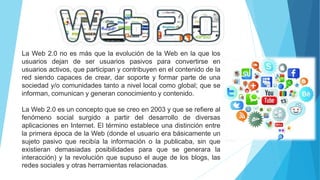 El documento describe las características de la Web 2.0, incluyendo que permite a los usuarios participar y contribuir al contenido en línea en lugar de ser solo espectadores pasivos. Describe algunas herramientas comunes de la Web 2.0 como blogs, wikis y redes sociales. También explica que la Web 2.0 usa tecnologías como AJAX que permiten aplicaciones web dinámicas y que los usuarios pueden acceder a datos y aplicaciones desde cualquier dispositivo a través de la nube.
