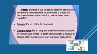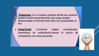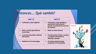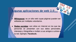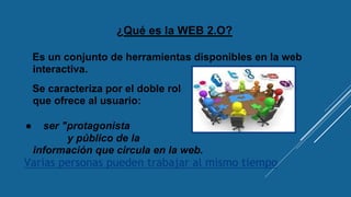 La Web 2.0 permite una mayor interacción y colaboración entre usuarios a través de plataformas que facilitan la socialización de conocimientos, la expresión de opiniones y la interrelación. Se caracteriza por dar a los usuarios un doble rol como protagonistas y público de la información compartida de forma interactiva.