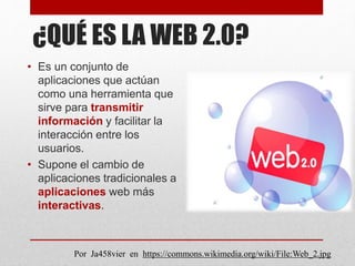 La Web 2.0 es un conjunto de aplicaciones interactivas que facilitan la comunicación entre usuarios y democratizan el acceso a la información. Tiene implicaciones tanto positivas como negativas en la educación, ofreciendo recursos colaborativos y motivadores, pero también con riesgos de privacidad y calidad de información. Se enfatiza la importancia de trabajar competencias digitales para sintetizar y comunicar la información de manera efectiva.