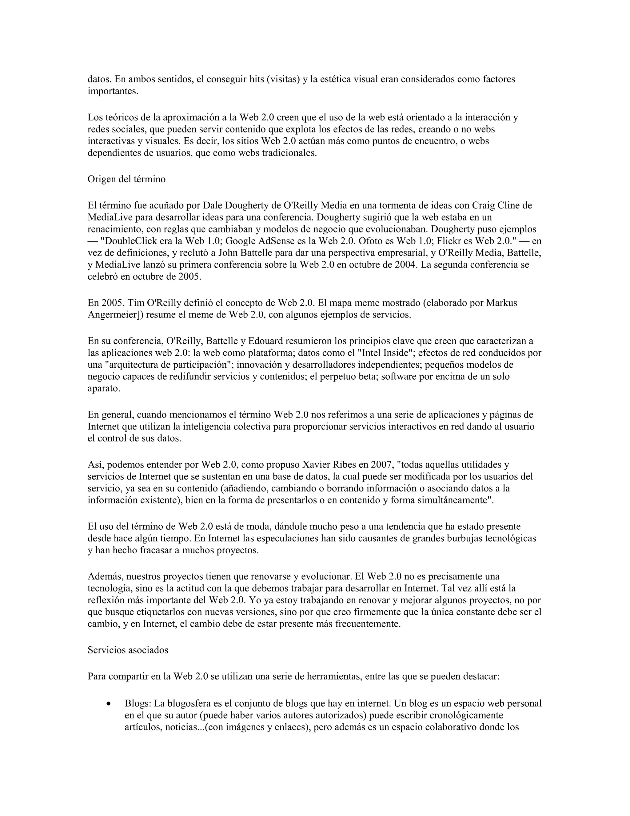 El documento habla sobre la Web 2.0, definida como una evolución de la Web 1.0 que facilita la interacción y colaboración entre usuarios a través de aplicaciones como blogs, wikis, redes sociales y servicios de alojamiento de videos y fotos. Algunas características clave de la Web 2.0 incluyen el uso de estándares como XML y la participación de los usuarios para modificar y añadir contenido.