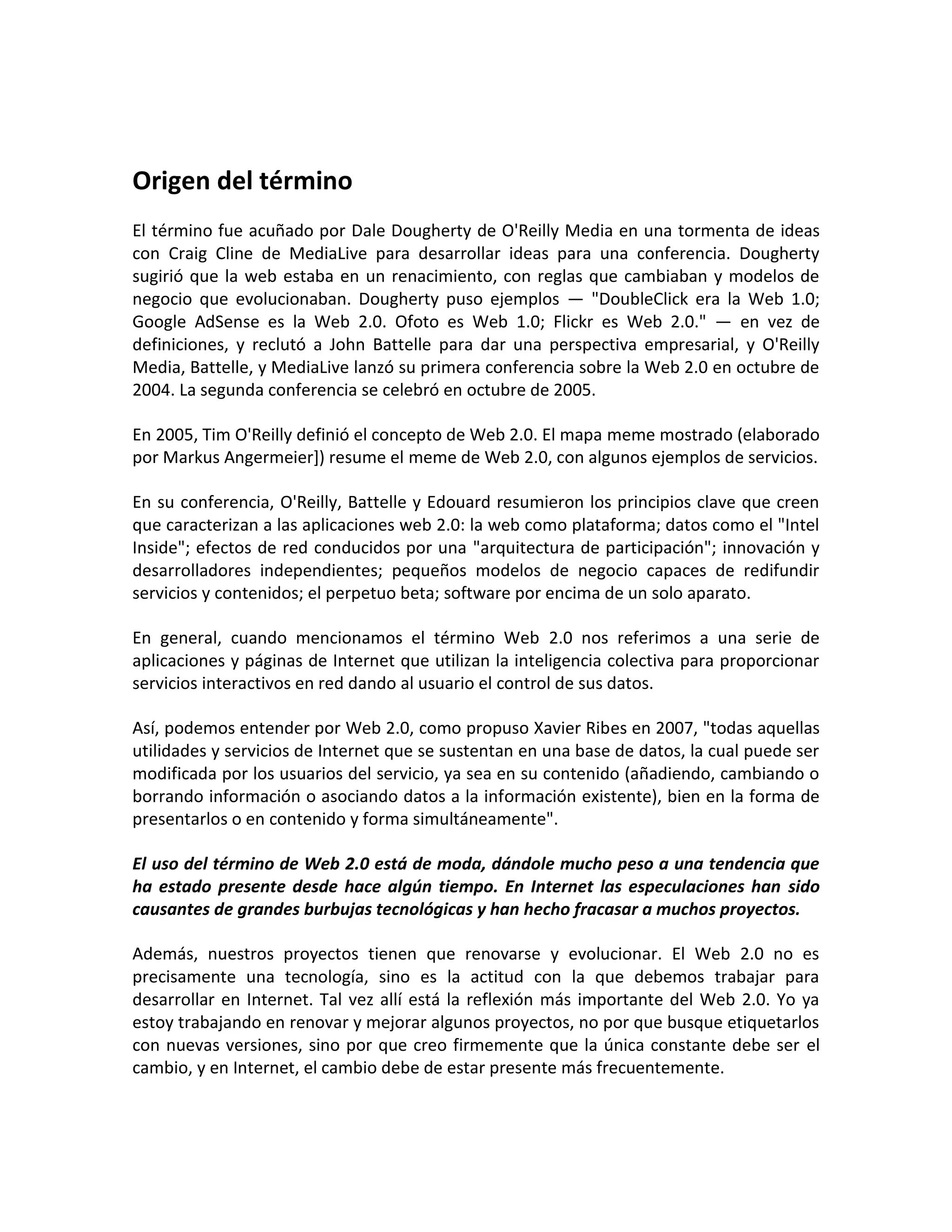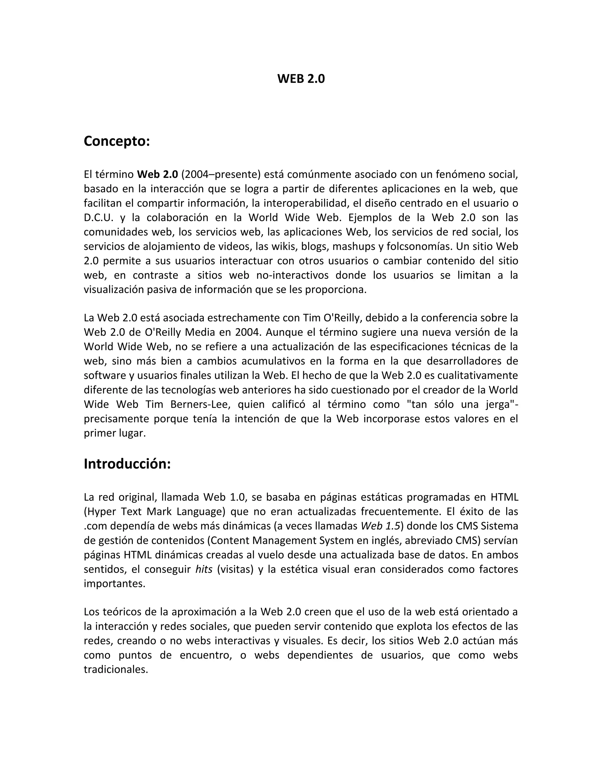 La Web 2.0 se refiere a aplicaciones web que facilitan la interacción y colaboración entre usuarios. Estas aplicaciones incluyen blogs, wikis, redes sociales y servicios de alojamiento de videos y fotos que permiten a los usuarios crear y modificar contenido. La Web 2.0 se basa en principios como datos como plataforma, efectos de red, software perpetuo y participación de los usuarios.