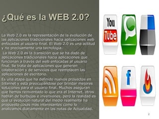 La Web 2.0 se refiere a la evolución de las aplicaciones web enfocadas en el usuario final, con colaboración y servicios que reemplazan aplicaciones de escritorio. Algunas tecnologías clave que apoyan la Web 2.0 incluyen Ajax, redes sociales, APIs abiertas y facilitar el posicionamiento web. El propósito de la Web 2.0 no es una receta tecnológica sino más bien una actitud de renovarse constantemente para desarrollar proyectos en Internet centrados en el usuario.