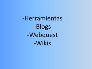 La Web 2.0 incluye herramientas como blogs, webquest y wikis que permiten una mayor interactividad entre usuarios y facilitan la creación y el intercambio de contenido.