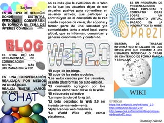Este documento describe la evolución de la Web 2.0, donde los usuarios pasan de ser pasivos a activos al participar y contribuir con contenido a través de blogs, redes sociales, sitios creados por usuarios y etiquetado colectivo. Además, señala que la Web 2.0 permite que los usuarios se informen, comuniquen y generen conocimiento de forma global como parte de comunidades en línea.
