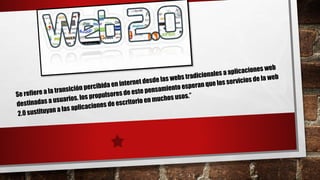 Este documento describe las ventajas y desventajas del uso de herramientas de la web 2.0 en la educación, así como algunas herramientas específicas. Las ventajas incluyen que las herramientas son fáciles de usar y permiten la colaboración y publicación de contenido. Las desventajas son que los estudiantes a distancia tienen menos capital cultural y los archivos pueden ser vulnerables. Algunas herramientas mencionadas son blogs, que permiten la comunicación síncrona, Google Sites para compartir documentos de forma atractiva