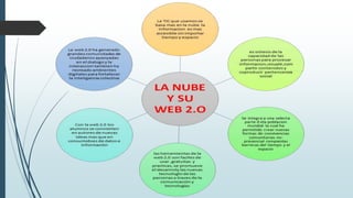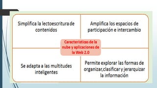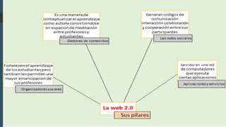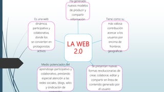 El documento describe las características de la Web 2.0 y algunas herramientas que la componen. La Web 2.0 es una web dinámica y participativa donde los usuarios se convierten en protagonistas activos que pueden crear y compartir contenido de forma colaborativa a través de blogs, wikis y redes sociales. También menciona algunas herramientas antiguas como los blogs y wikis que fortalecen el aprendizaje, y nuevas herramientas como WebQuest, el Big Six y la caza del tesoro.