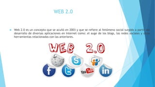 Web 2.0 se refiere al desarrollo de aplicaciones en Internet como blogs, redes sociales y herramientas relacionadas que permiten la interacción entre usuarios y el aporte de contenido. Se caracteriza por la participación activa de los usuarios que contribuyen contenido en lugar de solo consumirlo. Esto ha llevado a la democratización de los medios ya que cualquiera puede publicar información a bajo costo a través de blogs, redes sociales y otros canales en línea.