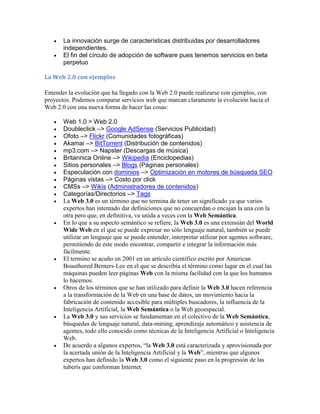 La Web 2.0 representa la evolución de las aplicaciones tradicionales a aplicaciones web enfocadas en el usuario final que fomentan la colaboración y reemplazan las aplicaciones de escritorio. La Web 3.0 se refiere a la posible evolución futura de la web hacia una mayor inteligencia artificial y semántica que permita a las máquinas interpretar mejor el contenido, aunque no existe consenso sobre su definición.