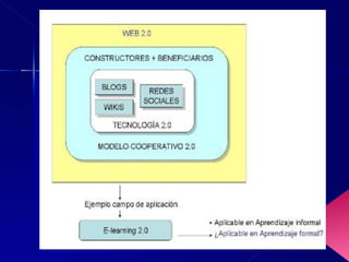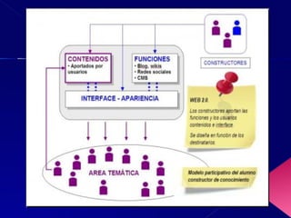 El documento habla sobre las nuevas generaciones de páginas web donde los usuarios comparten y producen contenido. Describe características como que la web es una plataforma para participación de los usuarios, los datos son la clave y pueden mezclarse, y aprovechar la inteligencia colectiva de los usuarios.