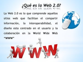La Web 2.0 permite compartir y colaborar información entre usuarios a través de plataformas como blogs, redes sociales, wikis y portales de videos y fotos. Se caracteriza por ser una plataforma funcional, simple y ligera que permite a los usuarios crear y distribuir contenidos digitales de forma flexible. La Web 2.0 funciona como una sociedad cibernética donde los usuarios comparten información que otros pueden usar para generar conocimiento.