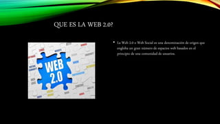 La Web 2.0 o Web Social es una denominación que engloba espacios web basados en el principio de comunidades de usuarios. Se caracteriza por ser una Web abierta y participativa donde los usuarios ya no solo consumen información, sino que pueden crearla y compartirla. Algunas herramientas de la Web 2.0 como Prezi, Slideshare, Issuu y Scribd permiten publicar y compartir presentaciones de manera que otros puedan revisarlas y aportar comentarios.