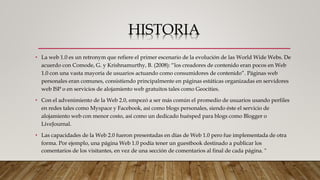 El documento describe la evolución de la Web, desde la Web 1.0 donde los usuarios eran principalmente consumidores de contenido estático, hasta la Web 2.0 caracterizada por la participación activa de los usuarios a través de herramientas como blogs, wikis y redes sociales que permiten generar y compartir contenido de forma colaborativa.