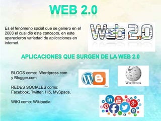 El documento describe la Web 2.0 y sus características principales. La Web 2.0 se refiere al surgimiento en 2003 de aplicaciones como blogs, redes sociales y wikis que permiten una mayor interactividad entre usuarios. Estas aplicaciones se diferencian de la primera generación de la web que solo permitía la publicación de contenido de forma estática. La Web 2.0 facilita ahora la publicación colaborativa y dinámica de contenido.