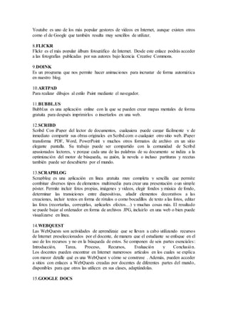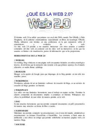El documento define la Web 2.0 como la evolución de la web original que permite a los usuarios interactuar y cambiar contenidos en los sitios web. Luego enumera 23 herramientas de la Web 2.0 como blogs, wikis, YouTube y Google Docs que facilitan la publicación y el intercambio de contenido entre usuarios. Finalmente, ofrece una definición personal de la Web 2.0 como un conjunto de herramientas que permiten editar, guardar y compartir información de manera privada o pública para fortalecer la comunicación e intercambio de información