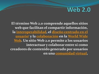 La Web 2.0 se refiere a una segunda generación de sitios web que facilitan la interacción y colaboración entre usuarios para generar y compartir contenido. Estos sitios incluyen blogs, redes sociales, wikis y servicios multimedia que permiten a los usuarios publicar información y trabajar juntos en línea. La Web 2.0 transformó a los usuarios de pasivos a activos al darles control para crear y compartir contenido usando herramientas como blogs, wikis y redes sociales.