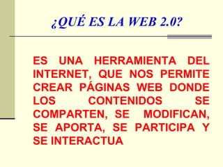 La Web 2.0 es una herramienta fundamental para la docencia del siglo XXI que permite crear páginas web donde los contenidos se comparten, modifican y se interactúa. Ofrece ventajas como la creación de espacios de comunicación entre docentes y estudiantes, fomenta el aprendizaje autónomo y el uso de las TIC. Existen más de mil aplicaciones de la Web 2.0 como blogs, podcasts, wikis y redes sociales que promueven la investigación, el trabajo en equipo y el aprendizaje.