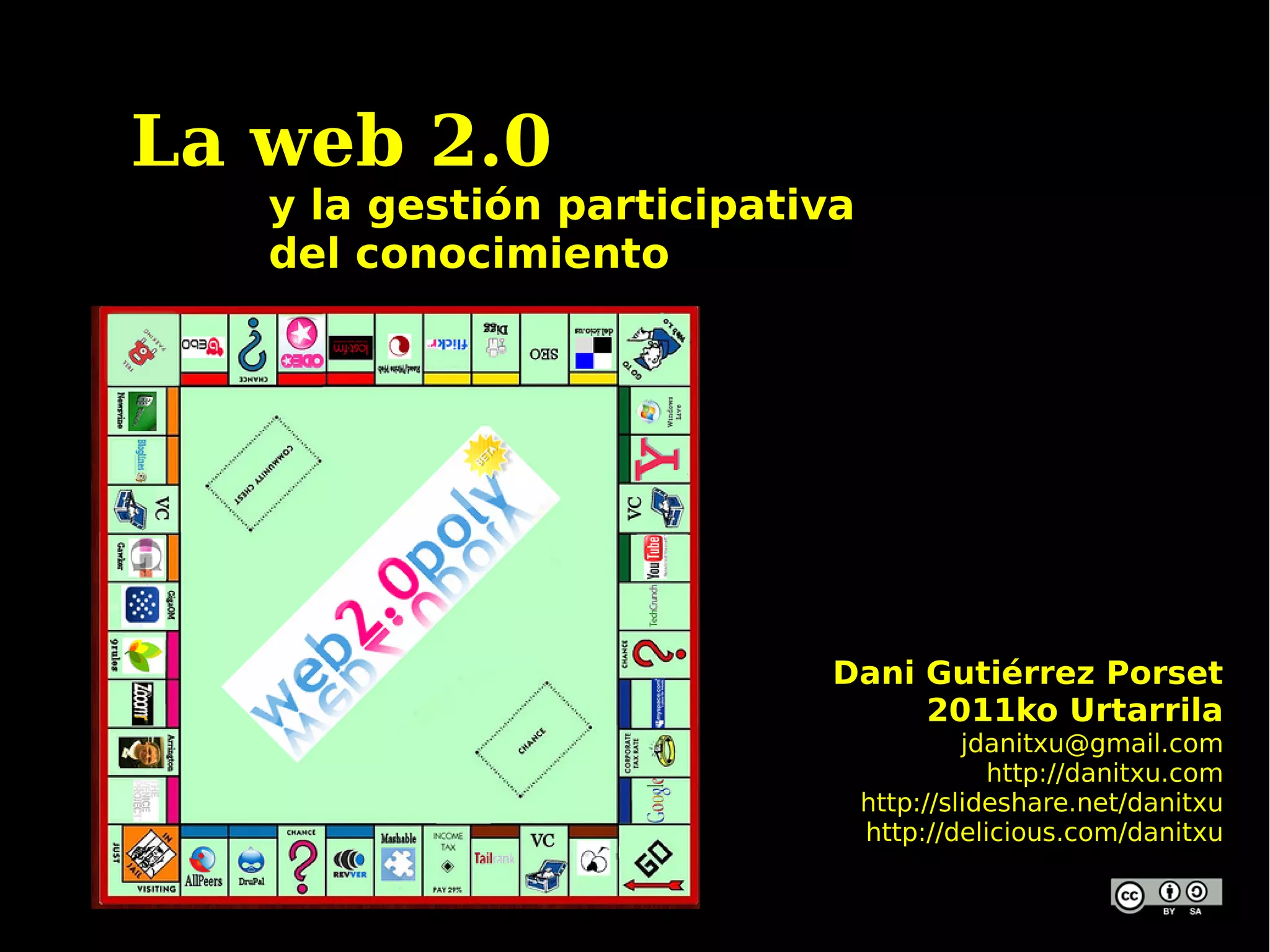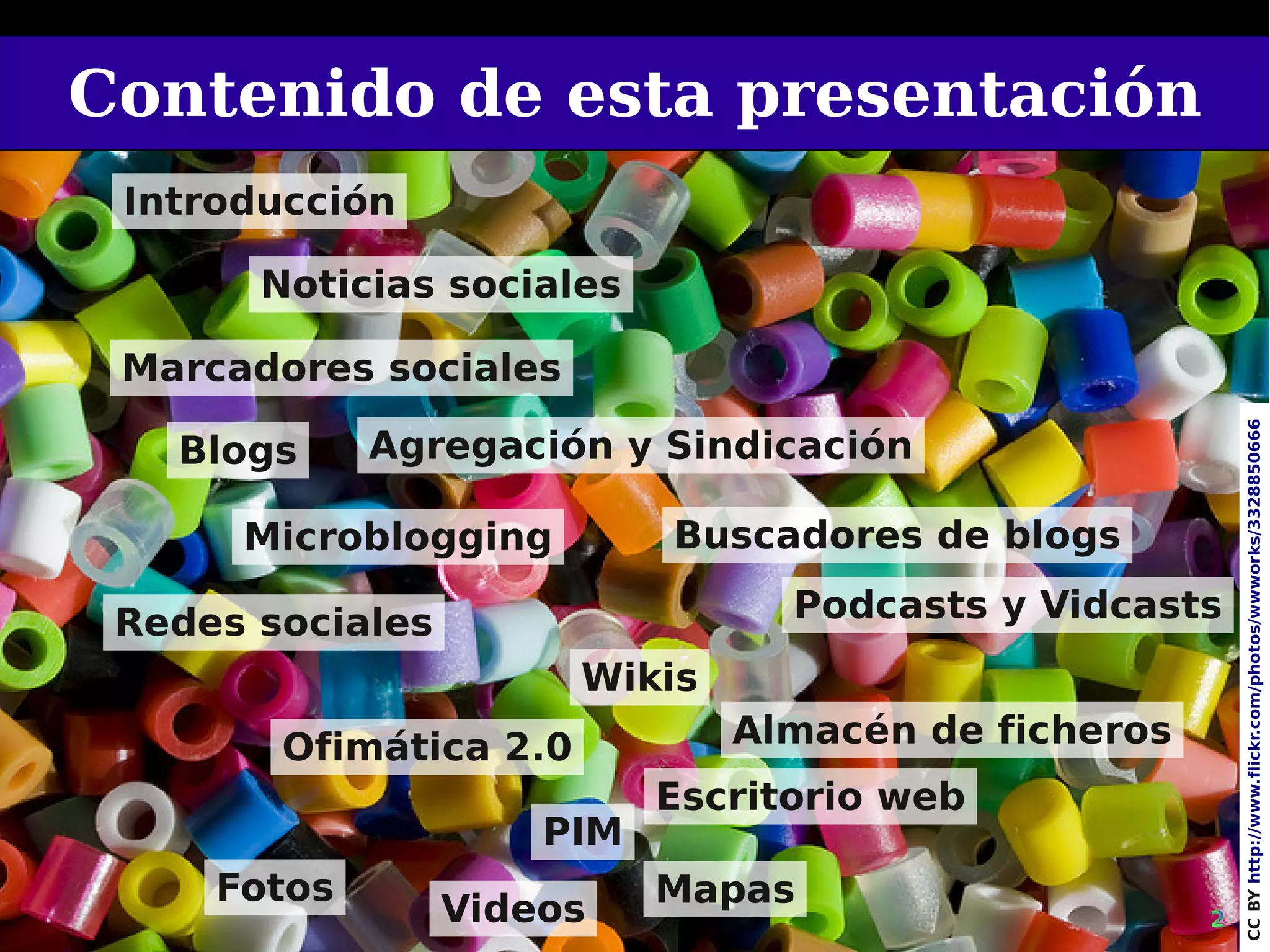 La web 2.0 se caracteriza por la participación de los usuarios, la sindicación y agregación de contenidos, y el uso de canales como RSS y Atom. Ofrece herramientas como blogs, wikis, marcadores sociales y podcasts que permiten la publicación y organización colaborativa de contenidos. Estas herramientas facilitan la generación y distribución de conocimiento colectivo.