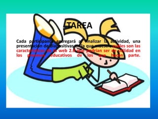 Este documento presenta las características de la web 2.0 que podrían ser útiles en procesos educativos, incluyendo blogs, wikis, redes sociales y YouTube. El autor argumenta que estas herramientas permiten el aprendizaje colaborativo y la construcción colectiva de conocimiento. Sin embargo, también señala riesgos como la proliferación de información poco veraz o el mal uso de redes sociales. El autor concluye que aunque la educación 2.0 tomará tiempo, las TICs permiten romper el paradigma del aula regular y