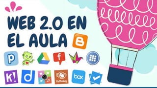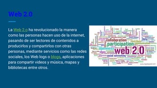La Web 2.0 ha revolucionado Internet al permitir que las personas produzcan y compartan contenido en lugar de solo leerlo. Esto ha llevado a características interactivas y colaborativas en la educación a través de herramientas como redes sociales, blogs y aplicaciones para compartir videos y música. Aunque la Web 2.0 ofrece ventajas como un aprendizaje más eficiente y acceso a información, también plantea desafíos como la calidad variable de la información y la sobrecarga de datos.