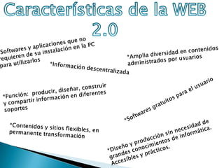 Este documento compara la Web 1.0 y la Web 2.0, y describe cómo la Web 2.0 puede ser útil para la educación. La Web 1.0 tenía una pequeña cantidad de creadores de contenido y páginas estáticas, mientras que la Web 2.0 permite a más personas crear y compartir contenido de forma dinámica. La Web 2.0 puede ser beneficiosa para la educación porque sus herramientas son fáciles de usar, permiten nuevas formas de comunicación, fomentan el aprendizaje colaborativo y el autoaprend