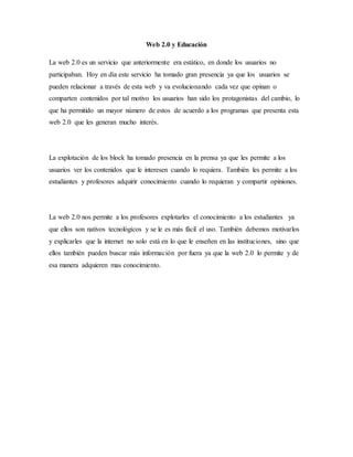El documento discute cómo la web 2.0 ha evolucionado de una plataforma estática a una que permite a los usuarios interactuar y compartir contenido. Esto ha generado un mayor interés entre los usuarios y ha permitido que tanto estudiantes como profesores puedan adquirir y compartir conocimiento de manera más flexible. La web 2.0 también facilita que los profesores exploten el conocimiento tecnológico nativo de los estudiantes y los motiven a buscar información más allá de la institución educativa.