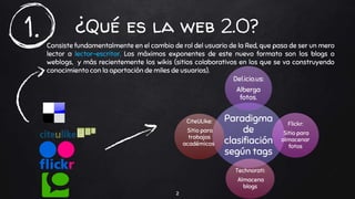 La Web 2.0 transforma el rol del usuario de pasivo a activo, promoviendo la creación y colaboración en línea a través de blogs, wikis y plataformas como YouTube y Google. Esta evolución genera nuevas formas de interacción y aprendizaje, dando lugar a comunidades virtuales y al intercambio de información en tiempo real. En el ámbito educativo, la Web 2.0 fomenta el aprendizaje colectivo, donde el conocimiento se construye de manera colaborativa entre estudiantes y docentes.