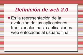 Este documento describe las características de la Web 2.0, incluyendo herramientas como blogs, wikis, redes sociales y entornos para compartir recursos que permiten una mayor interacción entre usuarios. Explica que la Web 2.0 representa la evolución de aplicaciones tradicionales a aplicaciones enfocadas en el usuario final, permitiendo que los usuarios publiquen y compartan contenido de manera colaborativa sin necesidad de ser expertos. También contrasta las diferencias entre la Web 1.0, que requería expertos y tenía usuarios estáticos