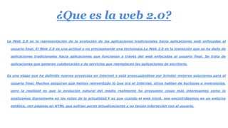 La Web 2.0 representa la evolución de las aplicaciones tradicionales a aplicaciones web enfocadas en el usuario final, que generan colaboración y reemplazan aplicaciones de escritorio. Se caracteriza por la participación de los usuarios en la creación y edición de contenido, el auge de blogs y redes sociales, y aplicaciones dinámicas.