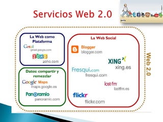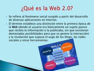 Este documento describe la Web 2.0 y cómo ha evolucionado de ser un medio de información pasiva a uno de interacción activa. La Web 2.0 aprovecha la inteligencia colectiva al involucrar a los usuarios y obtener su colaboración a través de blogs, wikis, redes sociales y otros servicios que facilitan la creación y compartición de contenido. Esto ha llevado del dominio absoluto de las empresas al escenario del usuario como gestor de la información.