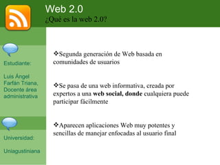 El documento describe las características de la Web 2.0, incluyendo que permite a los usuarios participar en la creación y compartir contenido en lugar de solo consumirlo, y que ofrece herramientas en línea que permiten realizar tareas sin software específico. También discute cómo la Web 2.0 ha transformado cómo compartimos información y trabajamos juntos a través de aplicaciones sociales.
