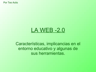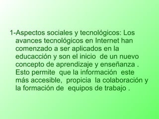 El documento discute las características de la web 2.0 y su impacto en el entorno educativo, resaltando la transición de modelos de enseñanza tradicionales a emergentes que fomentan el aprendizaje colaborativo. Se presentan diversas herramientas colaborativas como blogs, wikis y podcasts que facilitan la comunicación y el trabajo en conjunto entre estudiantes y docentes, promoviendo una educación más accesible y adaptativa. Asimismo, se contrasta el e-learning tradicional con el e-learning 2.0, subrayando las ventajas de este último en términos de dinamismo y flexibilidad.