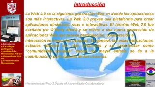 El documento describe las herramientas de la Web 2.0 y su aplicación para el aprendizaje colaborativo. Explica que la Web 2.0 permite crear aplicaciones dinámicas e interactivas que fomentan la participación de los usuarios. Luego enumera varias herramientas como Google Drive, redes sociales, mapas conceptuales y blogs que pueden usarse para apoyar el aprendizaje colaborativo. Finalmente, analiza criterios para evaluar estas herramientas.