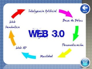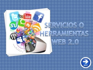 Este documento resume la Web 2.0 y sus características principales. La Web 2.0 permite la interacción del usuario y contenidos dinámicos, a diferencia de la Web 1.0 que tenía contenidos estáticos. Algunas herramientas clave de la Web 2.0 son wikis, blogs y redes sociales, las cuales facilitan la colaboración y compartición de información entre usuarios. La Web 2.0 fomenta una actitud de participación más que una tecnología en específico.