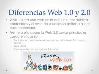 La Web 2.0 se caracteriza por la participación colaborativa de los usuarios a través de wikis, blogs, foros y redes sociales. Los principios de la Web 2.0 incluyen la orientación a Internet, comunidades de usuarios que se comunican, comparten, colaboran y confían, y la facilidad de uso a través de sistemas de gestión de contenido. Los ejemplos más comunes de la Web 2.0 son blogs, wikis, sistemas de gestión de contenido y aprendizaje, y plataformas para compartir imágenes, v
