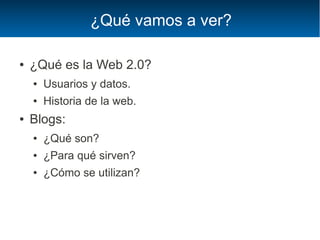 El documento habla sobre la Web 2.0 y los blogs. Explica qué es la Web 2.0, caracterizando la importancia de los usuarios y los datos. Luego describe qué son los blogs, para qué sirven y cómo se utilizan, incluyendo cómo crear un blog en Blogger o WordPress. Finalmente, discute usos educativos potenciales de los blogs en el aula.