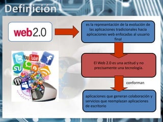 El documento aborda la transición hacia Web 2.0 y su aplicación en la educación, enfatizando la colaboración y la participación activa del usuario en la creación de contenido. Destaca que la Web 2.0 es un enfoque que promueve el aprendizaje colaborativo, el uso de herramientas digitales como blogs y redes sociales, y la gestión eficaz de la información. Además, se discuten diversas plataformas y herramientas digitales que pueden ser utilizadas tanto por docentes como por estudiantes para mejorar el proceso de enseñanza-aprendizaje.