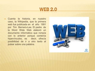 El documento describe la evolución del diseño web desde la Web 1.0 hasta la Web 2.0. La Web 2.0 ha supuesto una revolución con el usuario adquiriendo un papel más activo en la creación de contenidos. Esto ha llevado a la estandarización de ciertos elementos visuales como bordes redondeados, degradados y logotipos reflejados. Sin embargo, algunos diseñadores ahora se oponen a estos estándares de diseño 2.0.