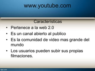 El documento compara sitios web de la Web 1.0 y Web 2.0, describiendo las características de YouTube, Instagram, Flickr y Fotolog como pertenecientes a la Web 2.0 porque permiten que los usuarios suban y compartan contenido de forma colaborativa y gratuita, mientras que Complexify.com se clasifica como Web 1.0 debido a su naturaleza lineal y falta de capacidades de colaboración.
