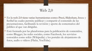 El documento describe varias herramientas de la Web 2.0 como Prezi, Slideshare e Issuu que permiten publicar y compartir presentaciones y contenidos. También describe la Web 3.0 que facilita dar significado adicional al contenido más allá de su significado textual. Luego resume plataformas como SlideShare para compartir presentaciones, Youtube para subir videos, Vimeo para editar videos de manera profesional, blogs para publicar historias de forma periódica y Pinterest para compartir imágenes en tableros temáticos.