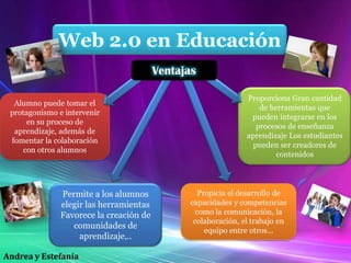 El documento describe las ventajas educativas de la Web 2.0, incluyendo que proporciona herramientas que pueden integrarse en la enseñanza, permite a los estudiantes ser creadores de contenido y tomar protagonismo en su aprendizaje, y fomenta la colaboración. También discute cómo la Web 2.0 apoya la educación a distancia facilitando la comunicación entre estudiantes distantes y el intercambio de datos para proyectos colaborativos. Finalmente, presenta varias herramientas educativas disponibles en la Web