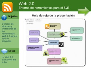 Este documento proporciona una introducción a las herramientas Web 2.0 y su aplicación en el Sistema de Estudios (SyE) de proyectos. Explica conceptos clave como Internet, la Web y la Web 2.0, y destaca cómo la Web 2.0 permite una mayor colaboración y clasificación colectiva de la información. También analiza cuestiones como los derechos de autor y presenta ejemplos de servicios como mapas de Google y Yahoo que pueden usarse en el SyE.