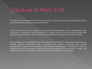 ¿Qué es la Web 2.0?La Web 2.0 es la representación de la evolución de las aplicaciones tradicionales hacia aplicaciones web enfocadas al usuario final. Es la transición que se ha dado de aplicaciones tradicionales hacia aplicaciones que funcionan a través del web enfocadas al usuario final. Se trata de aplicaciones que generen colaboración y de servicios que reemplacen las aplicaciones de escritorio.Esuna etapa que ha definido nuevos proyectos en Internet y está preocupándose por brindar mejores soluciones para el usuario final. Muchos aseguran que hemos reinventado lo que era el Internet, otros hablan de burbujas e inversiones, pero la realidad es que la evolución natural del medio realmente ha propuesto cosas más interesantes como lo analizamos diariamente en las notas de actualidad.