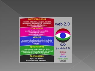 El usuario esgenerador de contenidos, puede editar y responder (blogs)El navegador o visitante tiene un rol activo, comparte información, participa y trabaja colaborativamente (googledocs)La interfaz es interactiva (igoogle)Posee fuentes múltiples de producción (wiki)Se forman comunidades de aprendizaje (Redes sociales)La combinación de estas herramientas producen la web 3.0