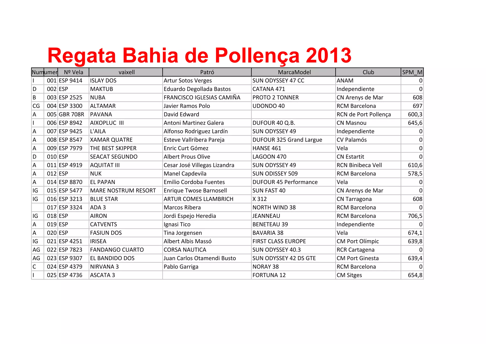 Este documento proporciona una lista de 25 barcos que participaron en la Regata Bahía de Pollença de 2013. Incluye el número de vela, nombre del barco, nombre del patrón, marca y modelo del barco, y el club al que pertenece cada embarcación. La regata tuvo lugar en la Bahía de Pollença, Mallorca, y contó con la participación de embarcaciones de España y el Reino Unido.
