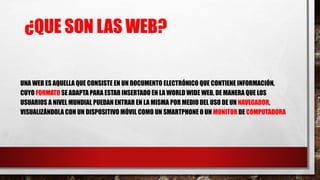 Una web es un documento electrónico que contiene información accesible a través de un navegador web. La Web 1.0 se caracterizó por ser unidireccional y estática, mientras que la Web 2.0 permitió la colaboración y compartición de contenido a través de blogs, wikis y redes sociales. La Web 3.0, también llamada web semántica, aprovecha la nube y dispositivos múltiples para proporcionar servicios al usuario de forma inteligente.