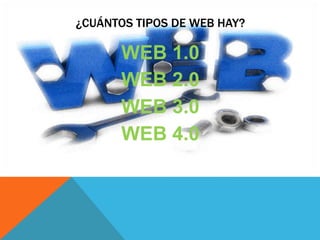 El documento describe los diferentes tipos de web que han existido hasta el momento. La Web 1.0 era una web estática con contenidos que no se actualizaban. La Web 2.0 evolucionó para convertirse en un "ecosistema" de información interactiva impulsado por usuarios. La Web 3.0, también conocida como Web Semántica, intenta que las máquinas comprendan mejor el significado y el contexto de la información en la web. Finalmente, la Web 4.0 apunta a conectar a las personas y objetos a través de la inteligencia ubicua